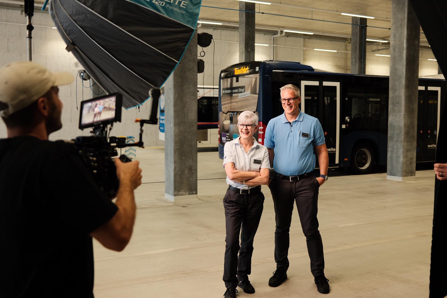 Die filmische Umsetzung folgt einem reduzierten, interviewgetriebenen Ansatz. Drei Mitarbeitende aus Fahrdienst, Technik und Unternehmensführung stehen stellvertretend für die gesamte Organisation und führen mit ihren persönlichen Aussagen durch den Film. Sie geben Einblick in Motivation, Verantwortung und den Zusammenhalt innerhalb der AVA. Die Dramaturgie entsteht ausschliesslich aus gezielt formulierten Fragen und den daraus entstehenden Antworten. Diese Herangehensweise bedeutete ein bewusst grösseres Restrisiko, ermöglichte jedoch eine besonders authentische und glaubwürdige Erzählweise. Ergänzt werden die Interviews durch beobachtende Bilder aus dem Arbeitsalltag – in Depots, Werkstätten, Leitstellen sowie im laufenden Betrieb auf Bus-, Tram- und Zuglinien. Die Planung und Umsetzung waren entsprechend anspruchsvoll: In 2,5 intensiven Drehtagen wurden 22 Locations zwischen Zürich, dem Aargau und Luzern realisiert. Wechselnde Lichtverhältnisse, feste Arbeitsabläufe und ein eng getakteter Fahrplan liessen keinen Spielraum für Verzögerungen. Dank enger Abstimmung mit der Leitzentrale, präziser Vorbereitung und konsequenter Planung entstand ein Unternehmensfilm, der die AVA nahbar, ehrlich und aus dem Inneren heraus erlebbar macht.