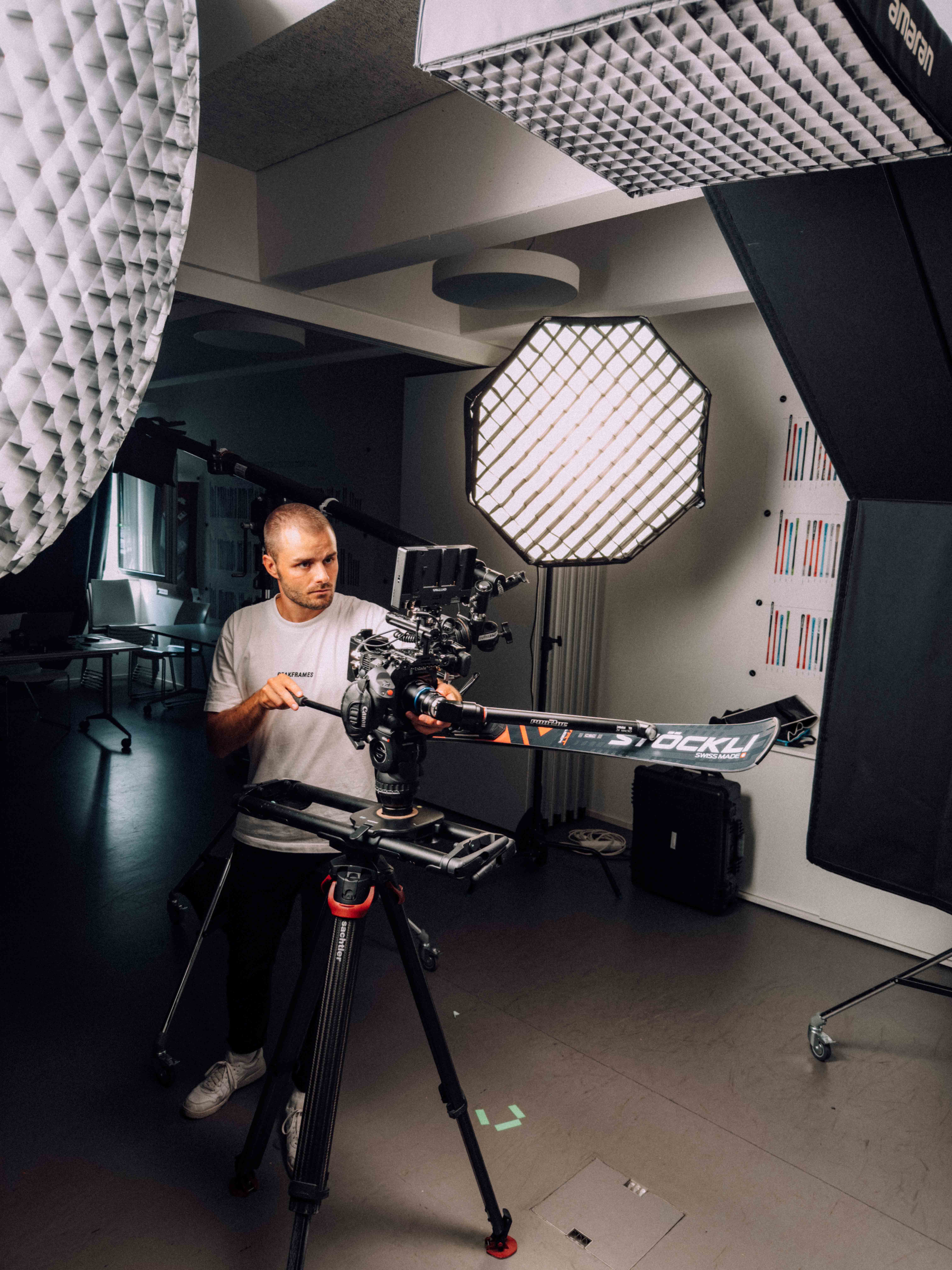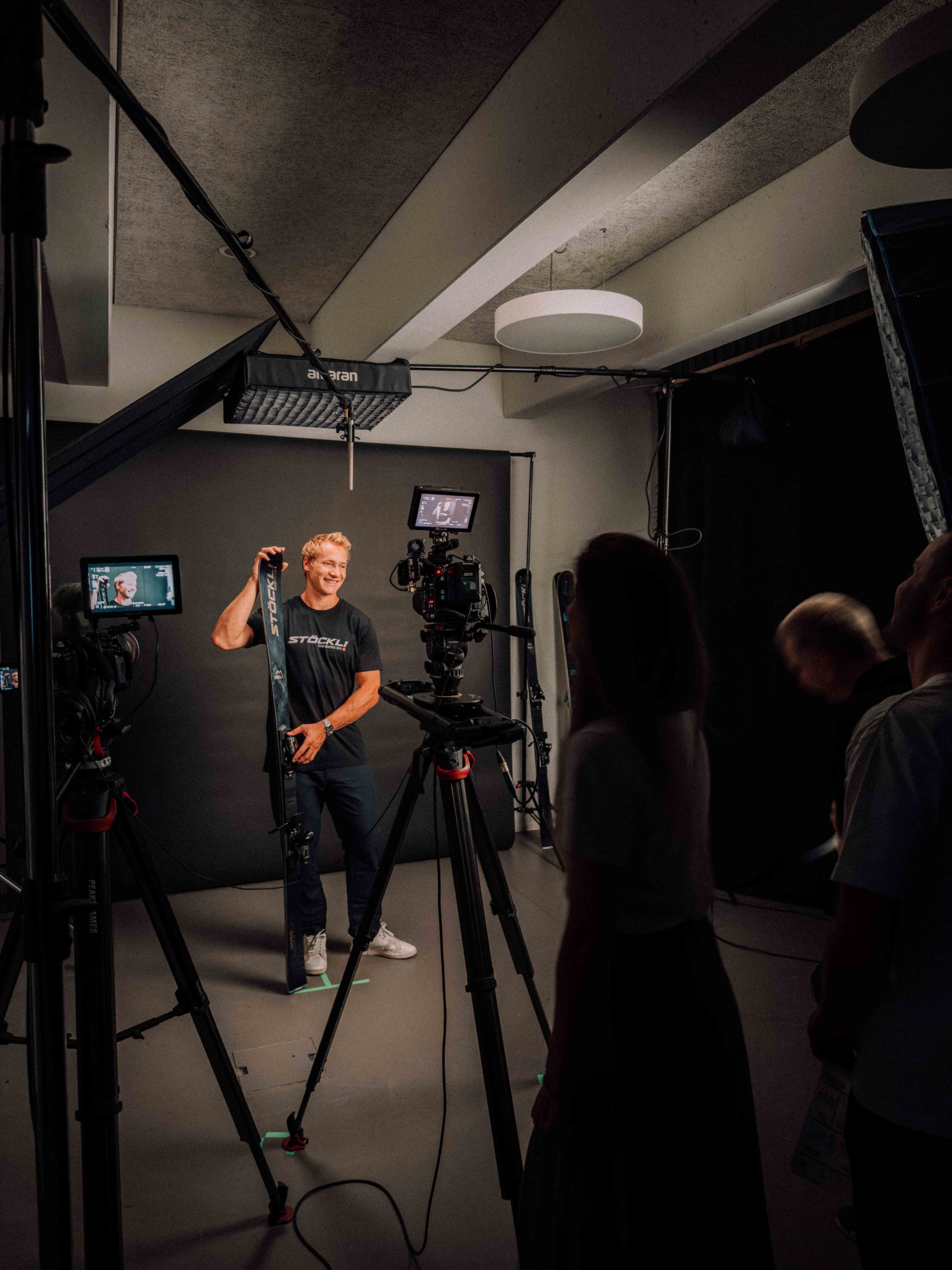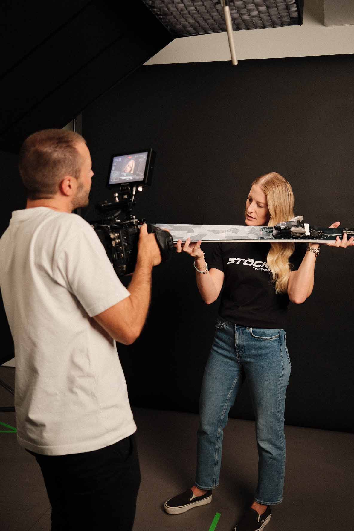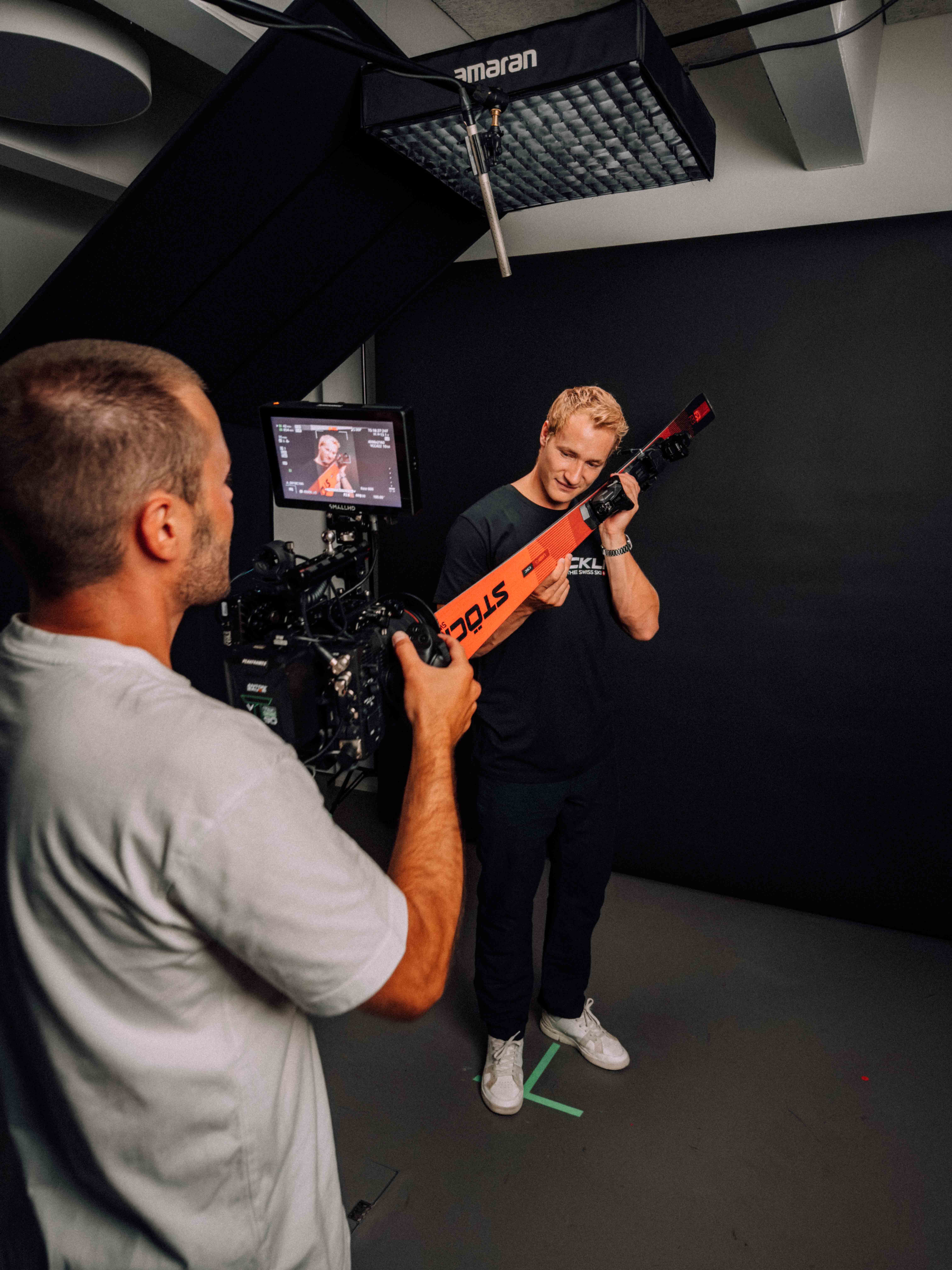 In der Umsetzung bauten wir auf der Grundidee von Stöckli sowie der darauf aufbauenden Konzeption von KSP auf. Unsere Verantwortung lag in der visuellen und filmischen Umsetzung. Schnell war klar, dass wir die Bildsprache bewusst reduzieren, um den Fokus konsequent auf den Menschen und das Produkt zu legen. Ein gezielt eingesetzter farblicher Kontrast bildet dabei den Gegenpol zum weissen „Spielplatz“ der Athleten. Um die unterschiedlichen Skimodelle eigenständig zu inszenieren, entstanden zusätzlich detaillierte Produktaufnahmen aller Modelle. Für besondere Nähe und Materialität kam eine Probe-Lens für Makroaufnahmen der Skioberfläche zum Einsatz. Für die Produktion richteten wir im Stöckli-HQ kurzerhand ein provisorisches Studio ein. Dieser pragmatische Ansatz entstand, da es bereits eine grosse Herausforderung war, alle Athleten während der Vorbereitungsphase an einem einzigen Tag zusammenzubringen.