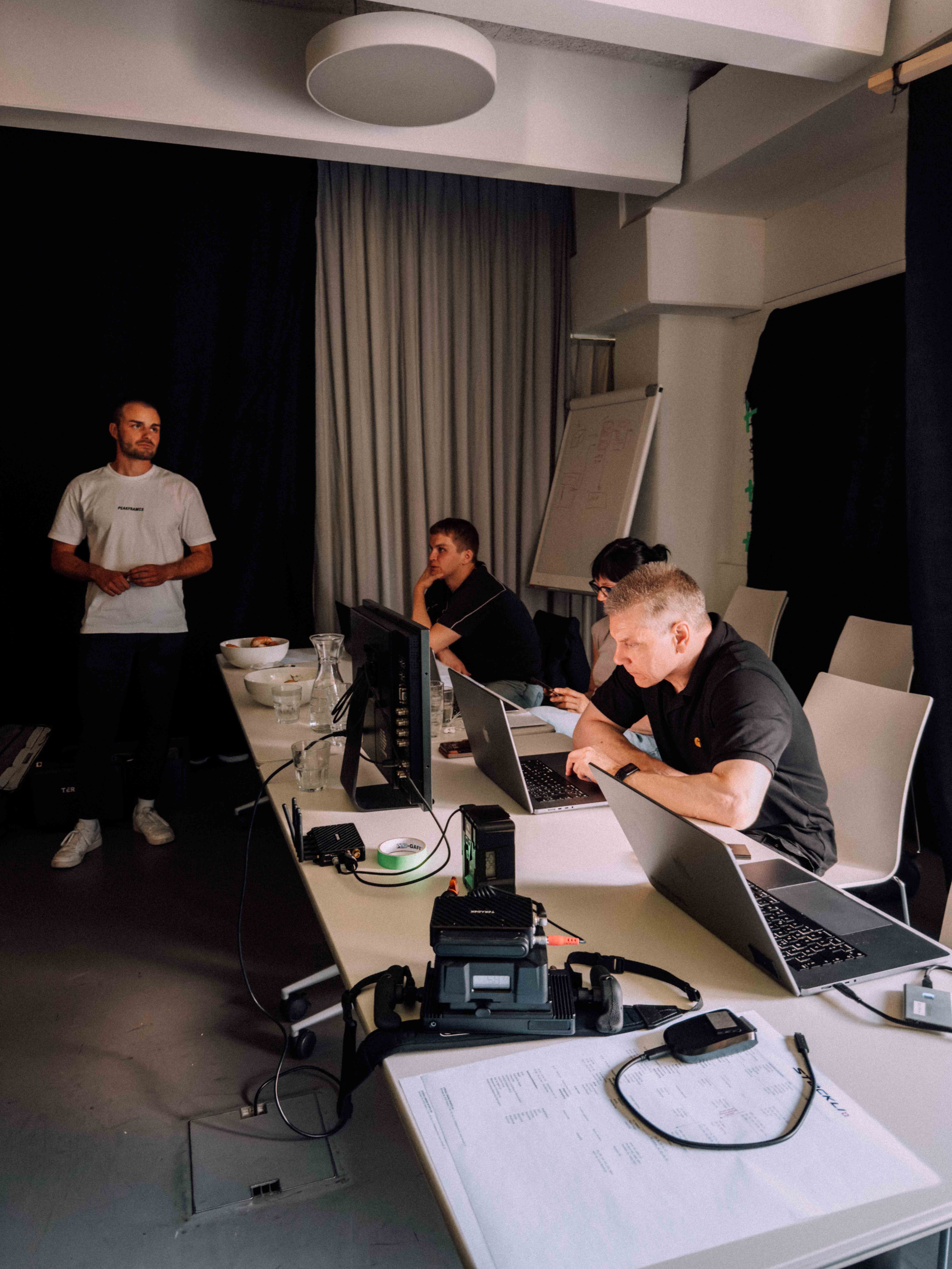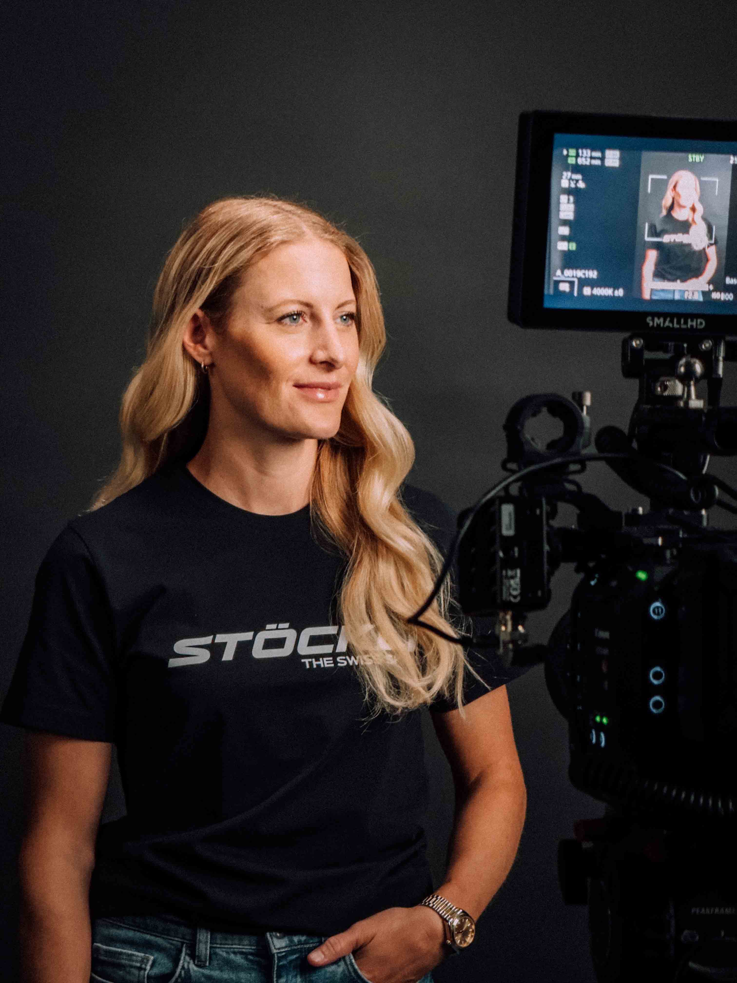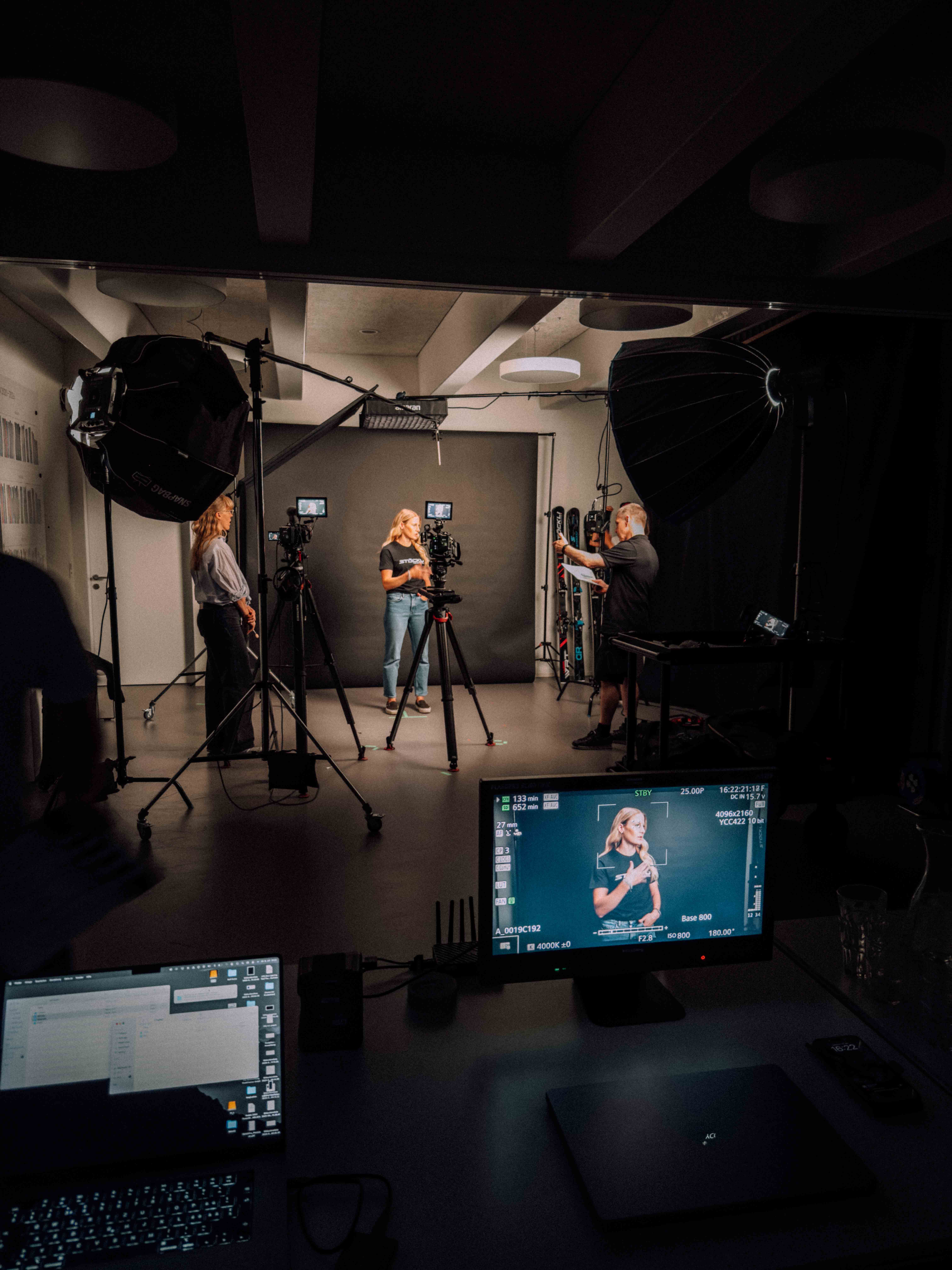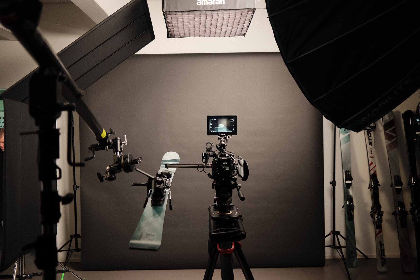 In der Umsetzung bauten wir auf der Grundidee von Stöckli sowie der darauf aufbauenden Konzeption von KSP auf. Unsere Verantwortung lag in der visuellen und filmischen Umsetzung. Schnell war klar, dass wir die Bildsprache bewusst reduzieren, um den Fokus konsequent auf den Menschen und das Produkt zu legen. Ein gezielt eingesetzter farblicher Kontrast bildet dabei den Gegenpol zum weissen „Spielplatz“ der Athleten. Um die unterschiedlichen Skimodelle eigenständig zu inszenieren, entstanden zusätzlich detaillierte Produktaufnahmen aller Modelle. Für besondere Nähe und Materialität kam eine Probe-Lens für Makroaufnahmen der Skioberfläche zum Einsatz. Für die Produktion richteten wir im Stöckli-HQ kurzerhand ein provisorisches Studio ein. Dieser pragmatische Ansatz entstand, da es bereits eine grosse Herausforderung war, alle Athleten während der Vorbereitungsphase an einem einzigen Tag zusammenzubringen.